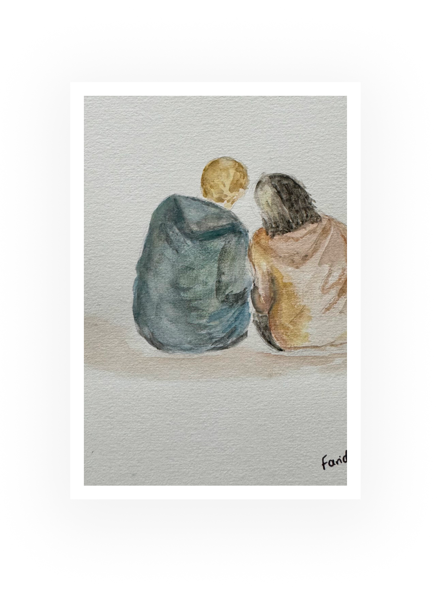 "Complicité en silence" capture un moment intime et profondément humain, où les mots sont superflus. Les silhouettes des deux figures, légèrement inclinées l'une vers l'autre, suggèrent une confiance et une compréhension mutuelle.