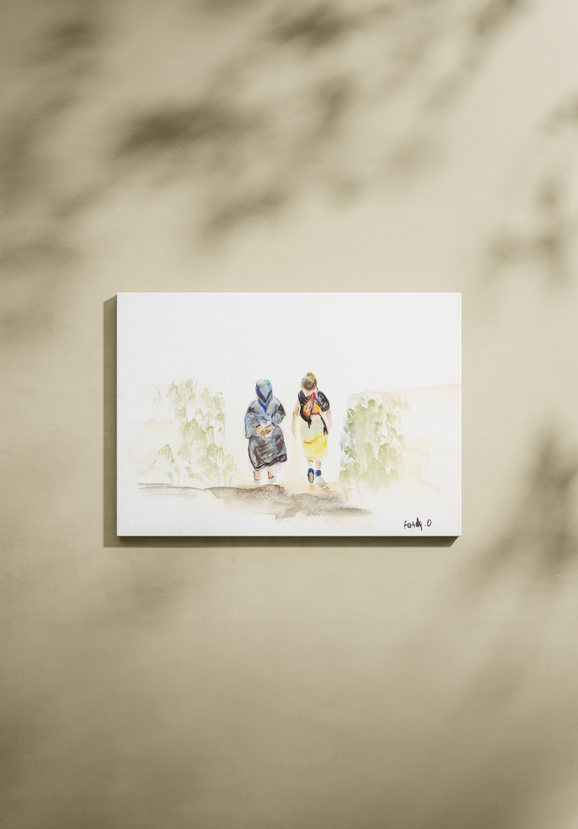 "Douceur kabyle" est une aquarelle qui capture un moment intime et précieux, représentant ma mère et moi marchant ensemble sur les chemins sinueux des montagnes kabyles. Cette œuvre, empreinte de tendresse et de nostalgie, rend hommage à la beauté naturelle de la Kabylie et à la profondeur des liens familiaux.