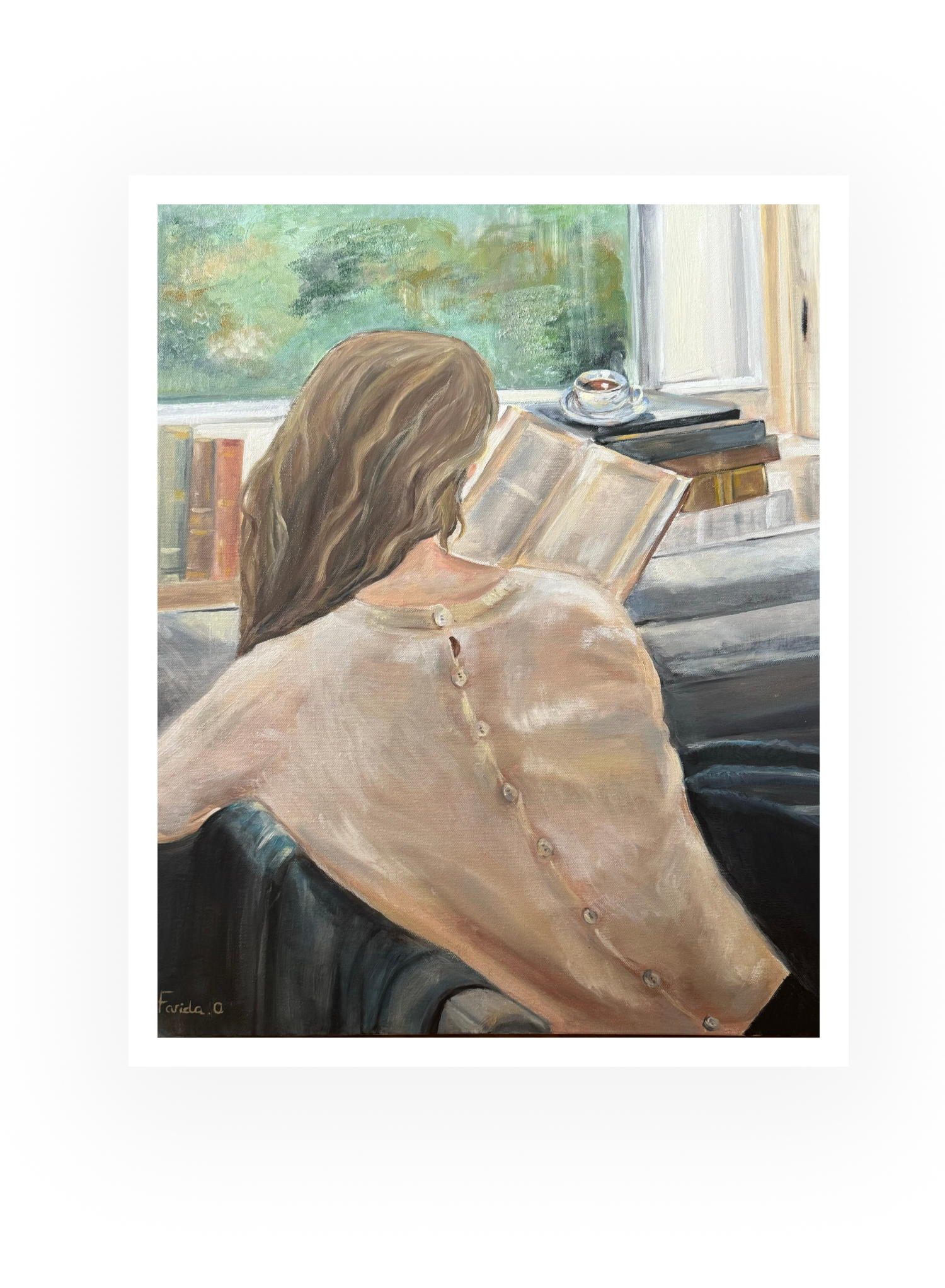 De dos, elle s'abandonne à la douceur de l'instant d’une après-midi automnale d’octobre, Le livre ouvert entre ses mains, elle plonge dans un autre monde, tandis que la lumière tamisée éclaire discrètement la scène.
