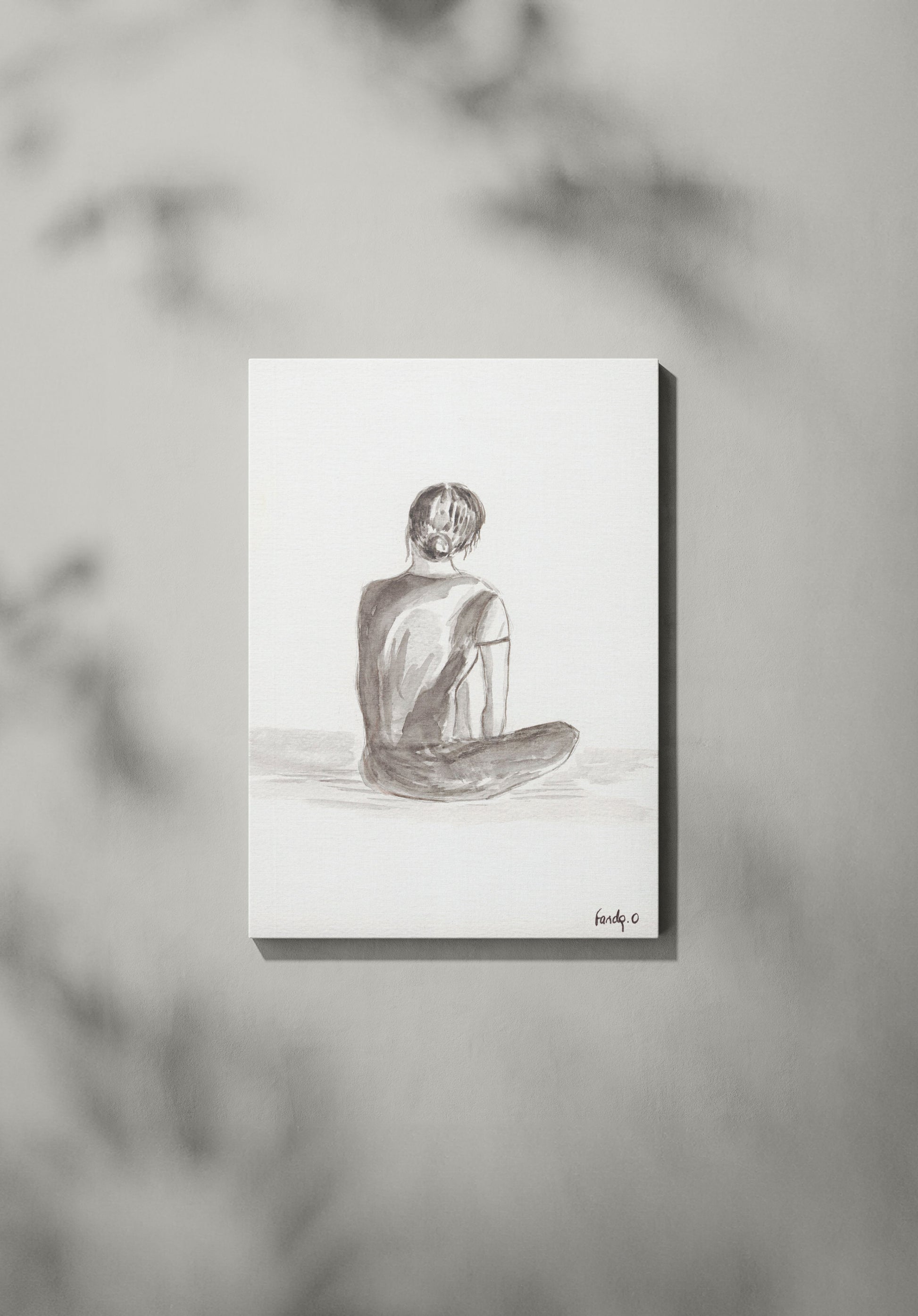 La femme, assise dans une posture de méditation, est représentée avec une élégance naturelle qui évoque une connexion profonde avec son être intérieur. Son dos droit et sa posture équilibrée suggèrent une harmonie entre le corps et l'esprit.