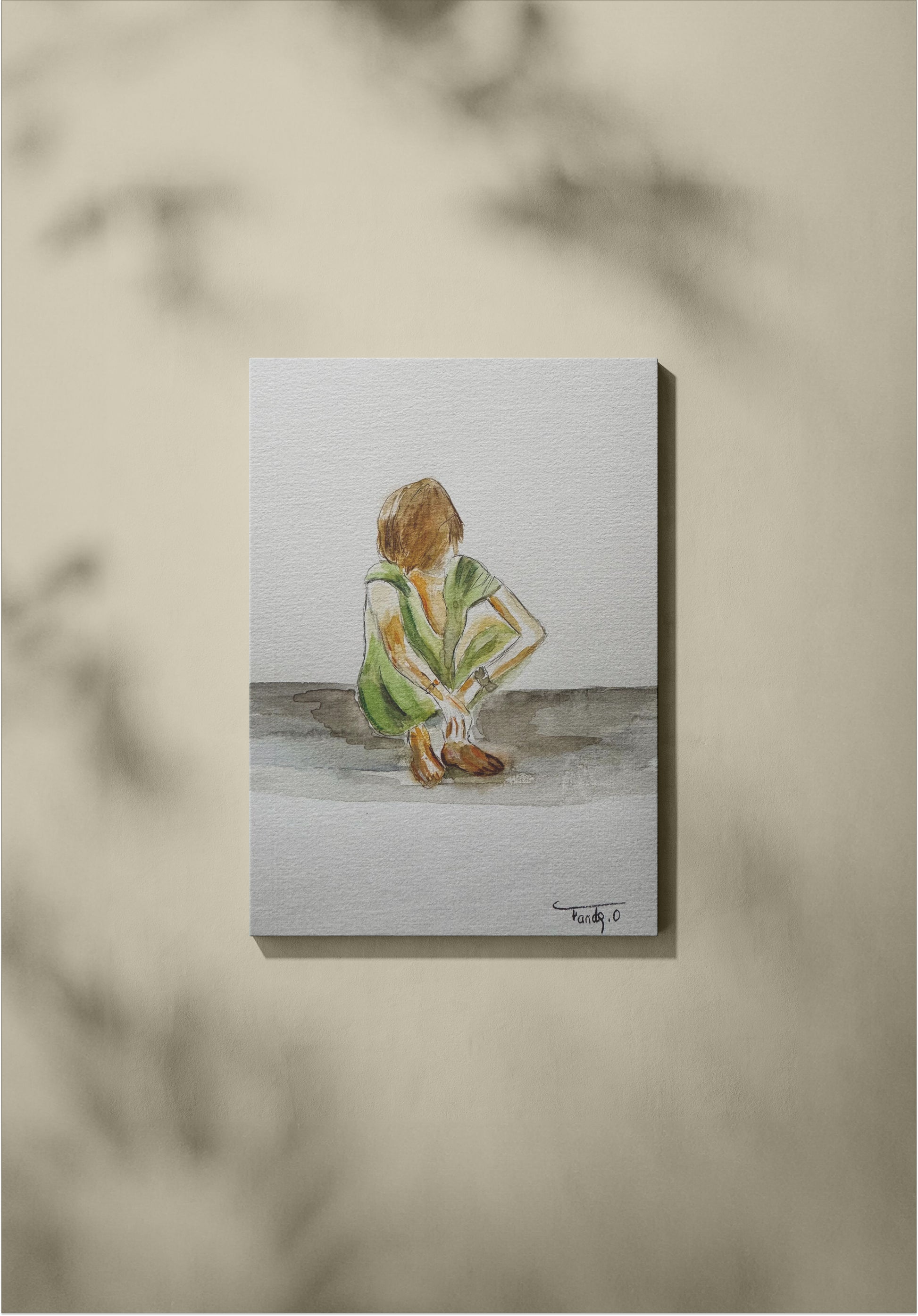 Dans cette scène empreinte de calme et de réflexion, une femme est assise en tailleur, ses genoux légèrement relevés, son regard fixé sur le sol devant elle. Sa posture dénote une tranquillité intérieure et une profonde concentration, comme si elle était plongée dans une méditation profonde ou dans un moment de profonde introspection.