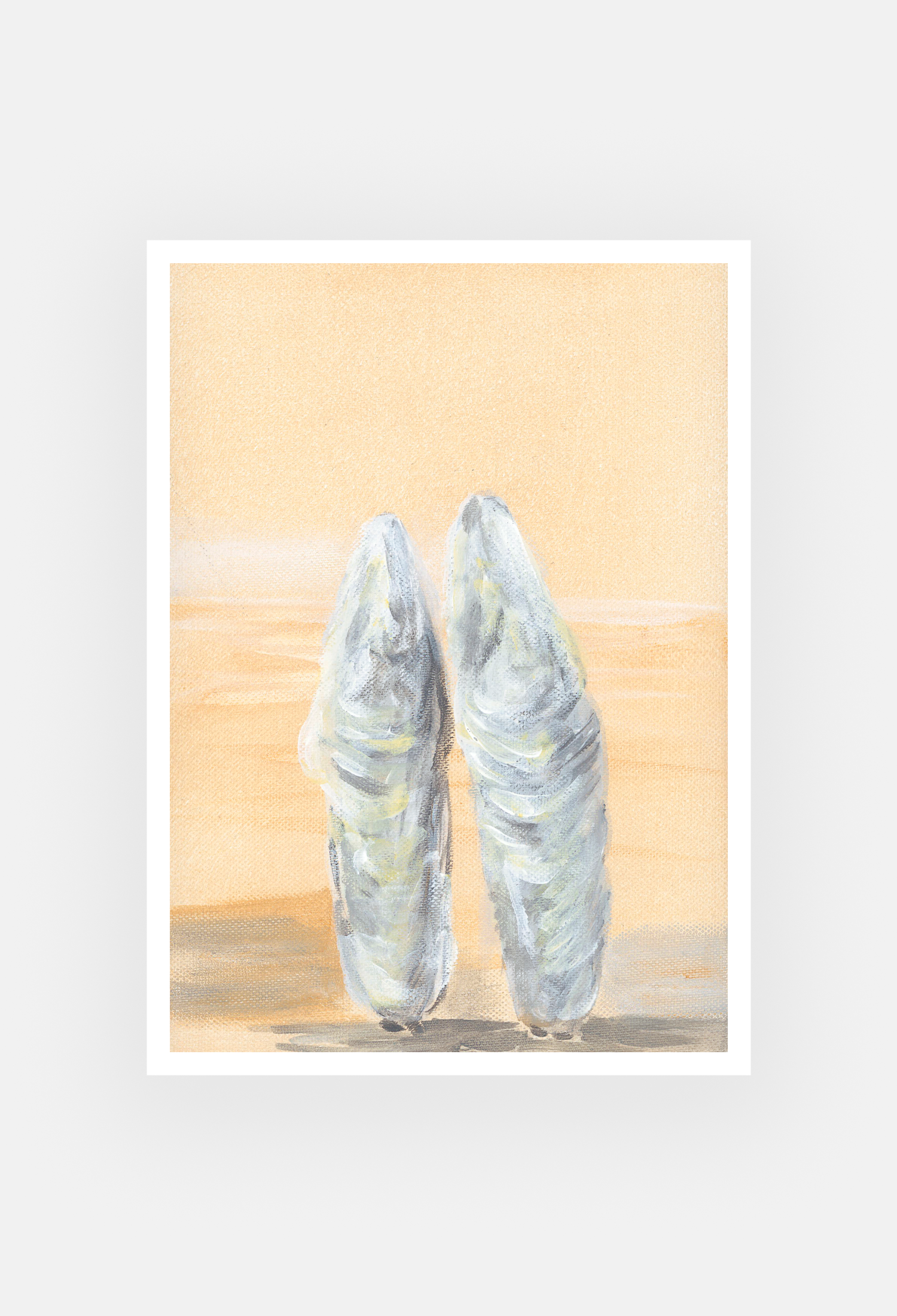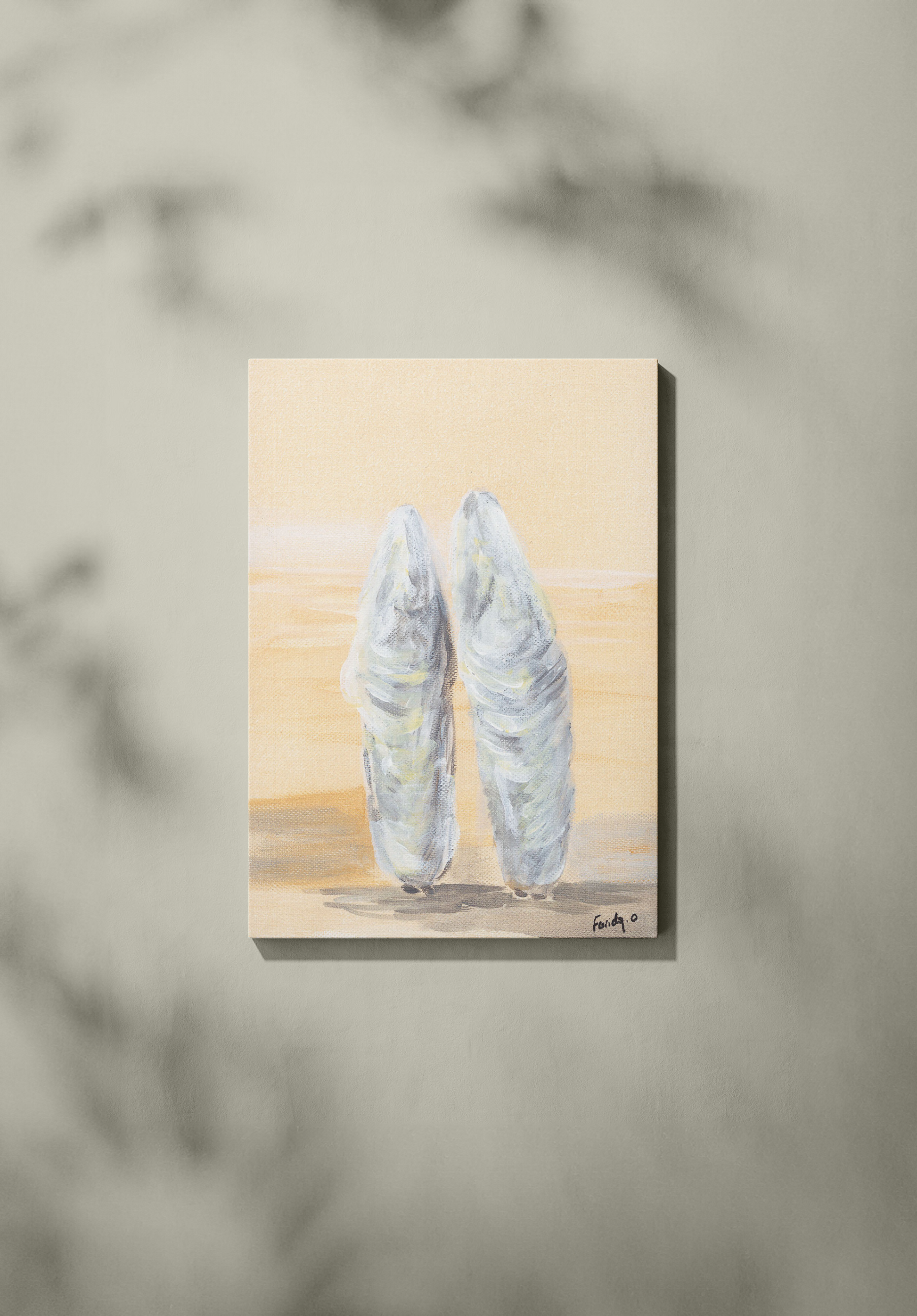 Dans le vaste désert, deux silhouettes féminines se dessinent, leurs voiles flottant légèrement dans la brise sableuse. Le tableau capture l'essence de la solitude et de la beauté austère du désert, où chaque détail est enveloppé dans une lumière dorée et une atmosphère de quiétude infinie.